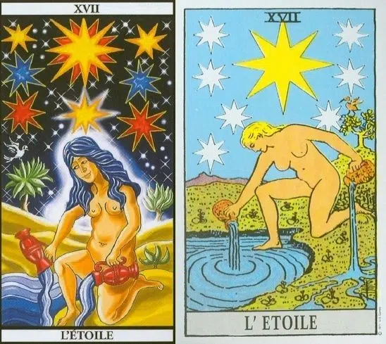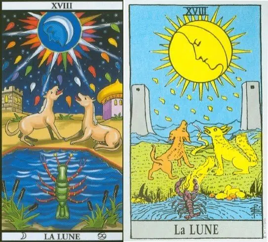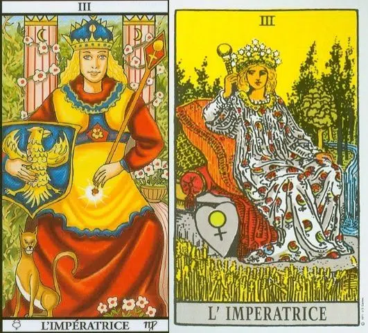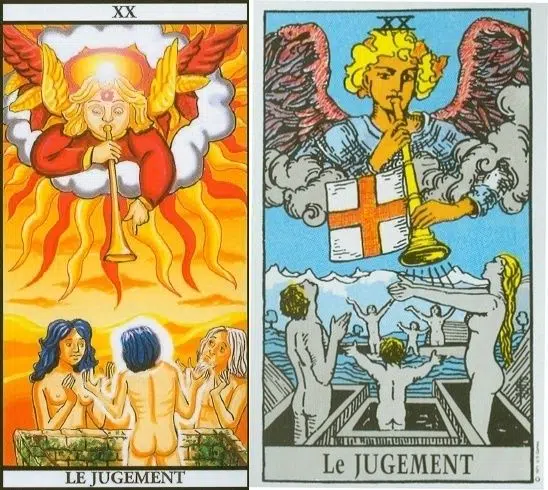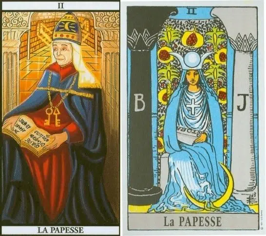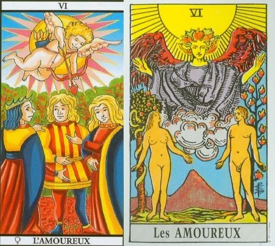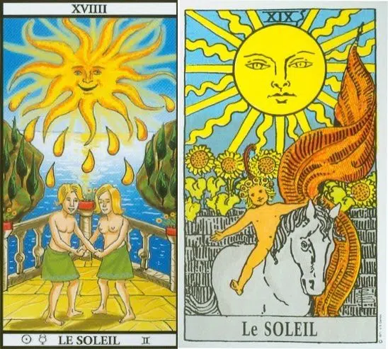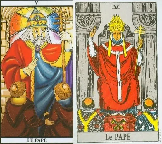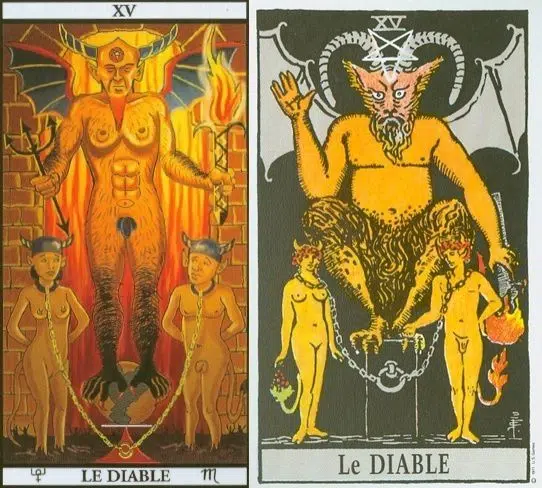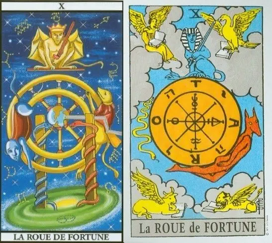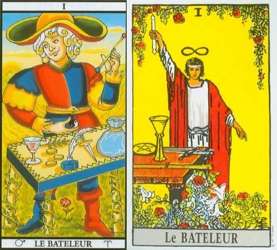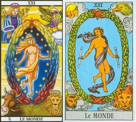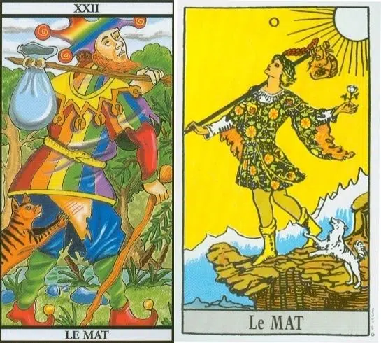 Concernant les illustrations, celle en couverture de cet article est le Tarot d'Oswald Wirth. Dans l'article, vous trouverez une version moderne du Tarot de Marseille (à gauche) et une du Tarot d'Arthur Edward Waite aussi dit Tarot Rider-Waite (à droite).