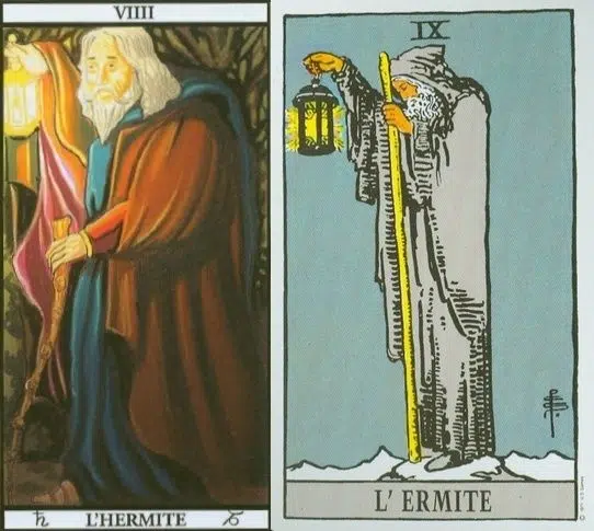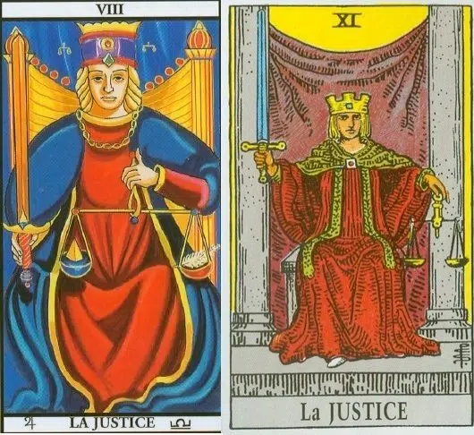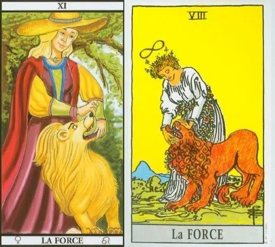 Il est à noter que Waite inversa les arcanes de La Force et de La Justice dans sa version contemporaine du Tarot. Elles sont ici présentées dans l'ordre propre au Tarot de Marseille (plus originel).