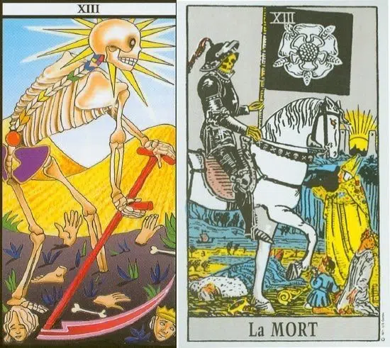 + Le chiffre maléfique 13 indique changement et renouveau plutôt que mort. Ouvre la voie aux transformations. Mort du vieil homme mais pas obligatoirement par mort physique. Ruine, fin.